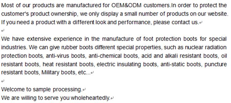 हम उत्पाद की गुणवत्ता को उद्यम विकास की जीवन शक्ति मानते हैं। हम केवल उच्च गुणवत्ता वाले रबर जूते का उत्पादन करते हैं, जो बाजार में उपलब्ध अन्य सामान्य उत्पादों से अनिवार्य रूप से भिन्न होते हैं। हम घटिया उत्पादों का कड़ा विरोध करते हैं।